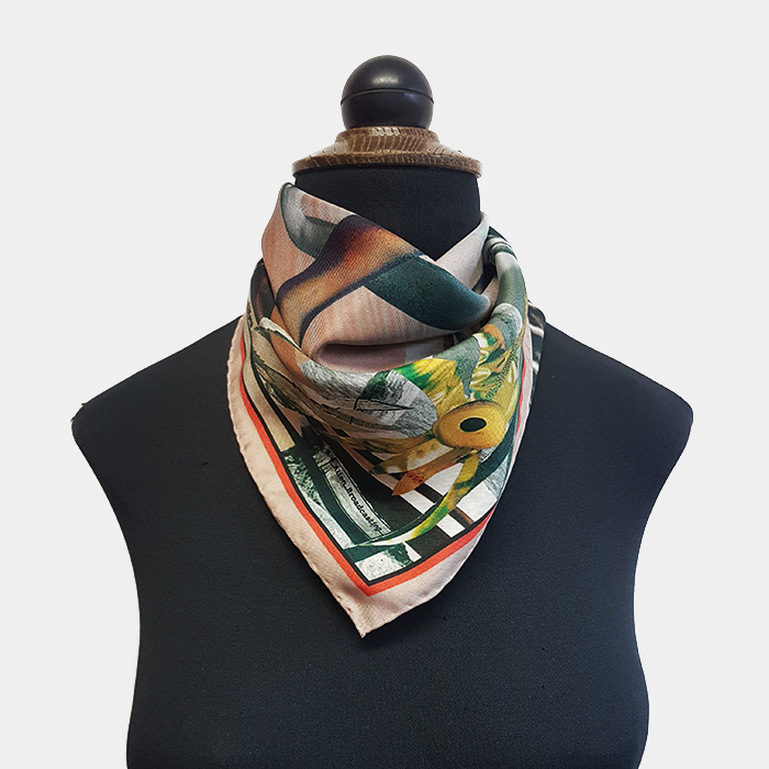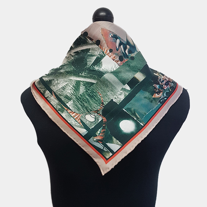 Hand cut collage transformed into twill silk scarf. Handrolled edges. Digitally printed and hand rolled in Manchester, UK.